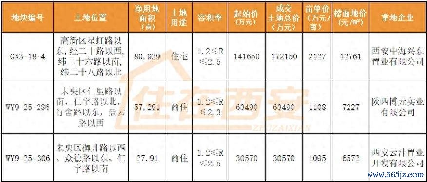 地块容积率1.2≤R≤2.5,地块起始价141650万元,成交总价172150万元,亩单价约2127万元/亩,楼面地价约12761元/㎡,摘地企业为西安中海兴东置业有限公司。