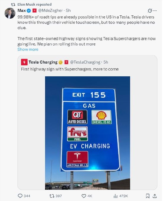 特斯拉北美充电业务主管Max de Zegher转发该帖子,并写道:“第一个显示特斯拉超充站的国有高速公路标志正在投入使用。我们计划在更大范围内推广这项服务。希望这有助于将公众的任何里程焦虑转化为对里程的信心。”