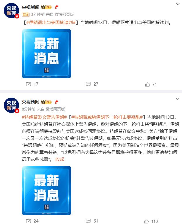 据央视新闻仁信配资,当地时间13日,伊朗正式退出与美国的核谈判。